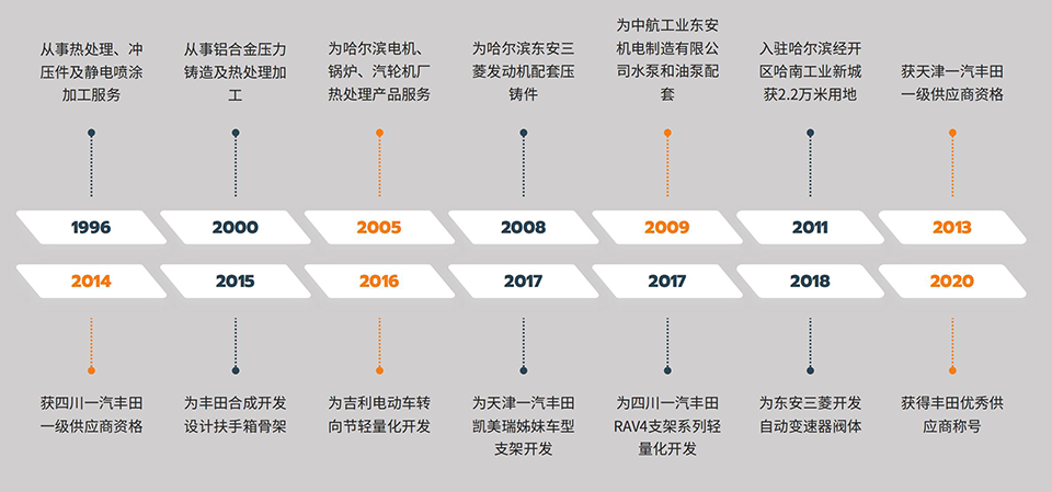 2007年始成为东安三菱配套商,为其生产凸轮轴盖(小盖、前盖、后盖)压铸毛坯系列,水管接头压铸毛坯系列。2008年成为东安微发配套商,为其配套生产水泵壳体、机油泵壳体、发电机前端盖、后端盖等压铸毛坯件。2011年开始为丰田开发支架类系列产品,并于2014年成为一汽丰田一级供应商。当年获一汽丰田颁发特殊贡献奖,并连续4年获品质达成奖。目前拥有挤压铸造生产线3条,拥有压铸机、加工中心、数控车床、中频熔炼炉、光饰机、喷丸机、三坐标、轮廓仪、粗糙度仪、圆柱度仪、直读光谱、测氢仪、硬度计等生产及检测设备30多台套。